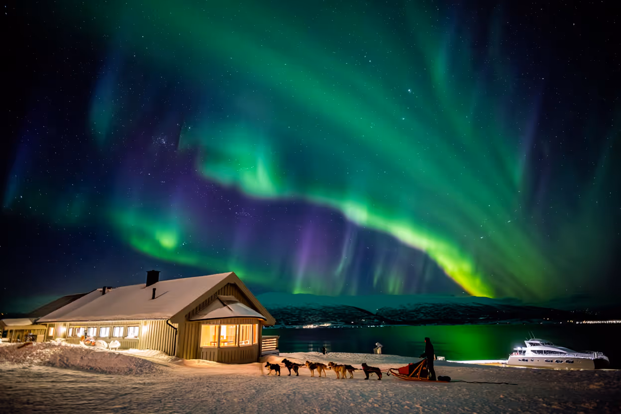 Et puis il y a Tromsø, porte d’entrée vers l’Arctique. Ici, les aurores boréales prennent une dimension presque théâtrale. Observer ces drapés lumineux depuis un lodge isolé, confortablement installé face aux baies vitrées, rappelle à quel point la nature peut encore surprendre. Les amateurs de sensations polaires pourront, à ce titre, prolonger l’expérience grâce à une sortie en chiens de traîneau ou une expédition en catamaran dans les fjords arctiques.